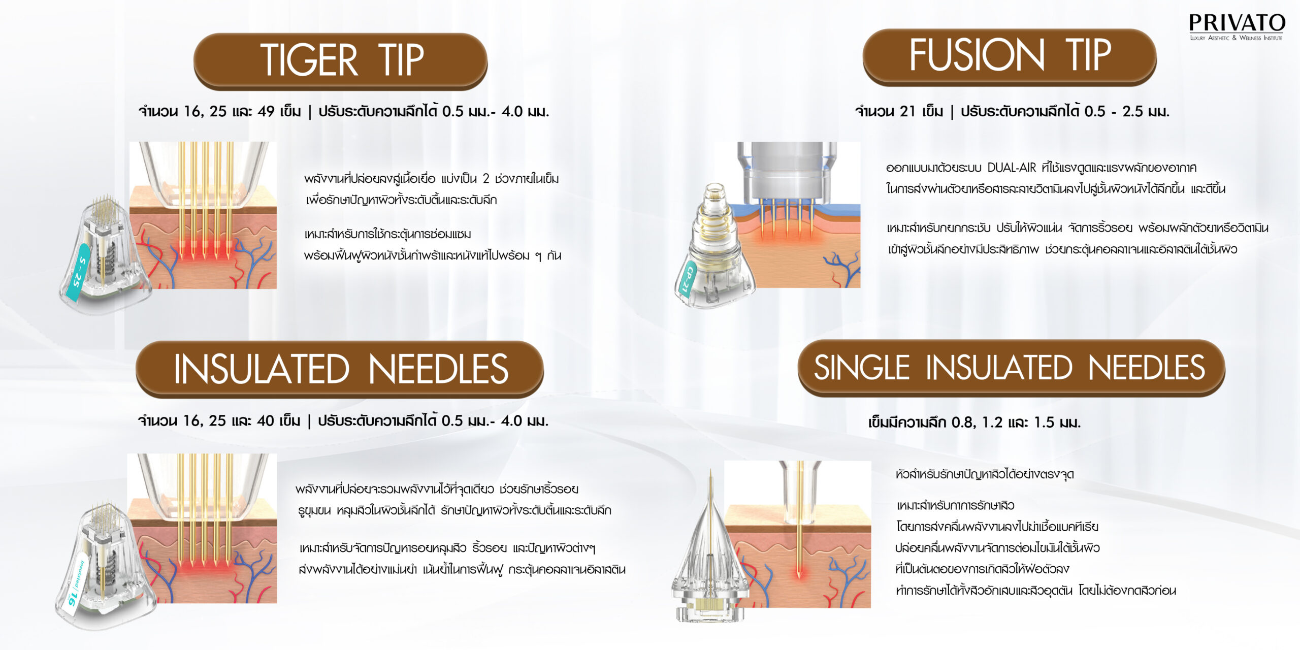 สำหรับ Insulated Needles หัวเฉพาะจากเครื่อง Potenza คือแอปพลิเคเตอร์ที่มาพร้อมกับจำนวนเข็มทั้งหมด 3 ระดับ ได้แก่ 16, 25 และ 40 เล่ม สามารถปรับระดับความลึกได้ 0.5 มม.- 4.0 มม. โดยจะมีจุดเด่นอยู่ที่หลักการทำงานที่รวมพลังงานไว้ในจุดเดียว เหมาะสำหรับโหมด BIPOLAR ที่จะใช้รักษาเฉพาะจุด สามารถส่งพลังงานไปใต้ผิวชั้นลึกได้อย่างแม่นยำ ตอบโจทย์การฟื้นฟูปัญหาหลุมสิว ริ้วรอย และความหย่อนคล้อยของผิวได้เป็นอย่างดี