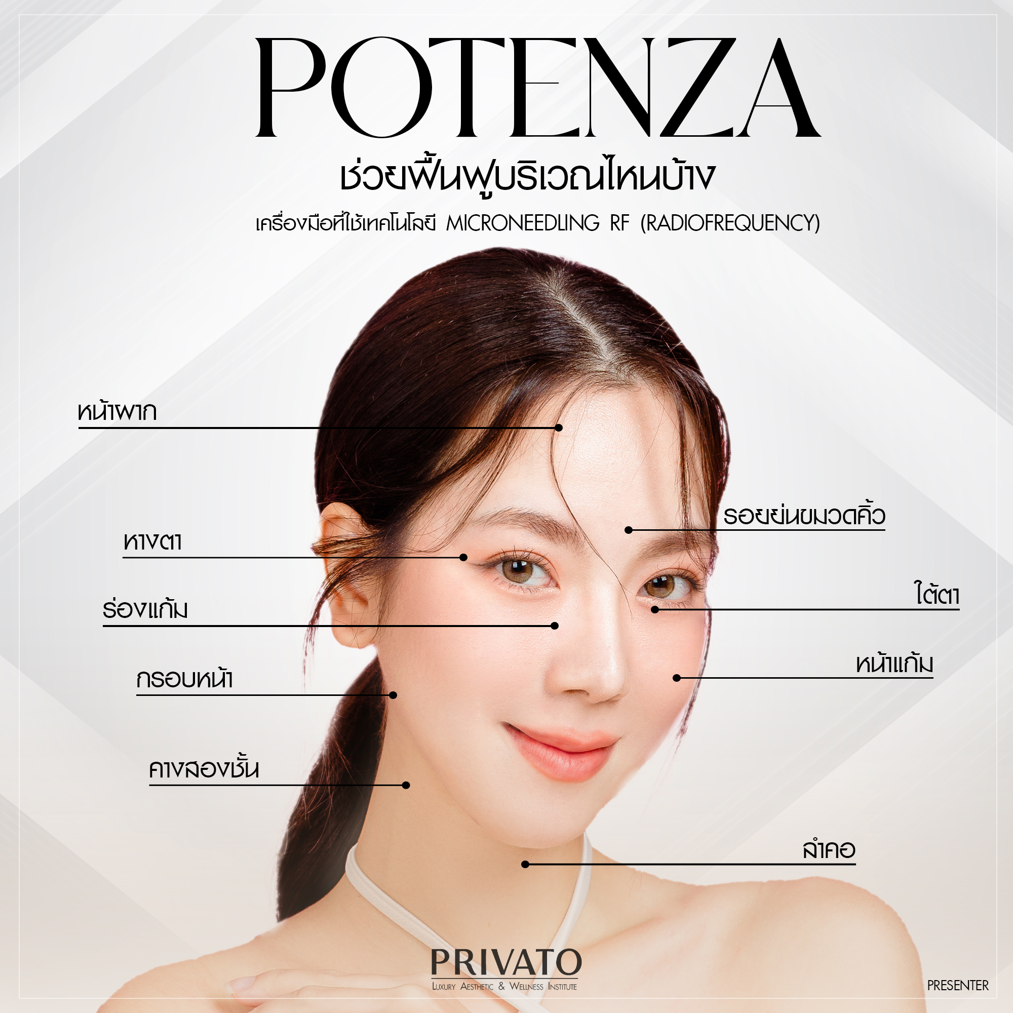 โปรแกรมโพเทนซ่า (Potenza) คือ การทำหัตถการด้วยเครื่องเลเซอร์เทคโนโลยีพิเศษ ด้วย 4 MODE RADIO FREQUENCY MICRONEEDLING ที่มาพร้อมกับคลื่นพลังงาน MONOPOLAR, BIPOLAR, 1 และ 2 Mhz สำหรับการดูแลปัญหาผิวแบบ “ครอบคลุม” ตอบโจทย์ทั้งการยกกระชับ ฟื้นฟูคอลลาเจนและอีลาสตินใต้ผิว ตลอดจนการแก้ปัญหา ซ่อมแซม รักษาสิวและรอยแผลจากสิว สู่ผลลัพธ์ความอ่อนวัย ให้ผิวตึงกระชับ หน้าเข้ารูป ไปพร้อม ๆ กับการมีสภาพผิวที่สมดุล แลดูกระจ่างใส