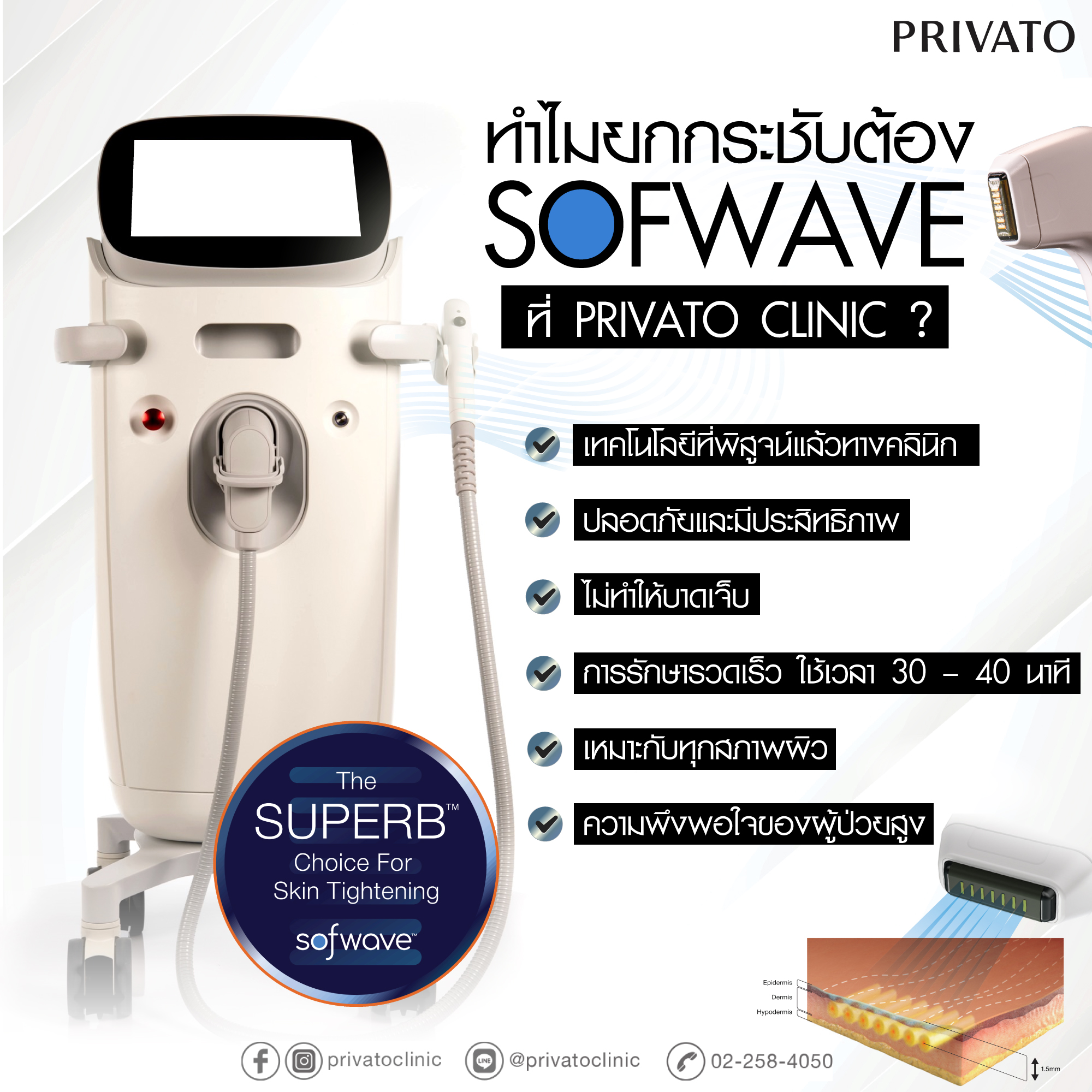 เปิดประสบการณ์ใหม่ในการยกกระชับ ด้วยผลลัพธ์ที่เหนือกว่าที่เคย กับบริการทำ Sofwave ที่ Privato Clinic คลินิกความงามชั้นนำที่ให้บริการโดยทีมแพทย์ผิวหนัง ที่มีความเชี่ยวชาญด้านการรักษาด้วยเทคโนโลยียกกระชับ ด้วยประสบการณ์ในการรักษามากกว่า 10 ปี ทีมแพทย์ของเราพร้อมให้คำปรึกษาก่อนทำหัตถการทุกเคส พร้อมออกแบบการรักษาให้ตอบโจทย์กับความต้องการของผู้เข้ารับบริการแต่ละบุคคลโดยเฉพาะ (Personlized treatment) เพื่อช่วยเสริมสร้างความมั่นใจ ให้คุณดูดีที่สุดในสไตล์ของตัวเอง