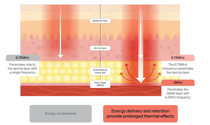 โหมดสำหรับชั้นลึก (6.78 MHz + 2.0 MHz) ช่วยสลายไขมันบางส่วนโดยไม่ทำลายเนื้อเยื่อรอบข้าง และทำให้ผิวตึงกระชับขึ้น