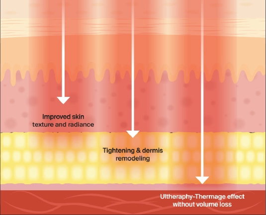 พลังงานคลื่นความถี่ทำงานตื้น เพื่อกระตุ้นการผลิต Collagen และ Elastin ช่วยให้ผิวกระชับและปรับสภาพผิวชั้นนอกได้อย่างมีประสิทธิภาพ